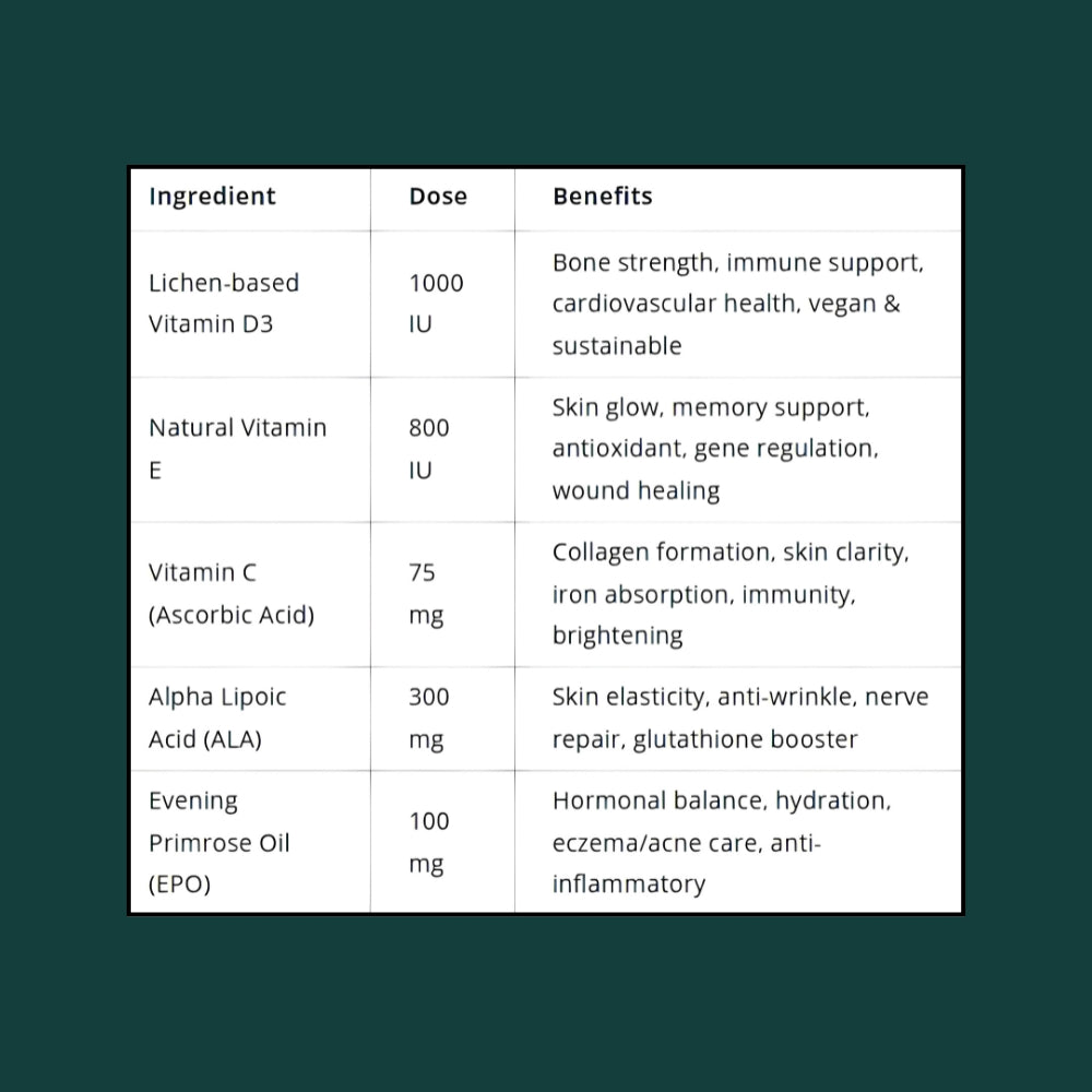 A next-generation liposomal antioxidant and immune-support syrup that delivers five synergistic nutrients directly to your cells for maximum absorption and effect. Each 5 ml dose combines Vegan Vitamin D₃ (1000 IU), Natural Vitamin E (800 IU), Vitamin C (75 mg), Alpha-Lipoic Acid (300 mg), and Evening Primrose Oil (100 mg) to recharge skin, immune, hormonal and neurological well-being daily.