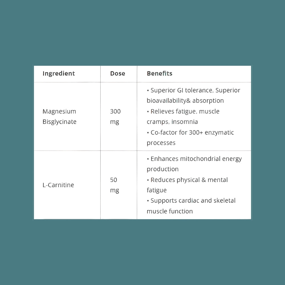 • Magnesium Bisglycinate supports over 300 enzymes involved in ATP production, muscle relaxation, and nerve stability.